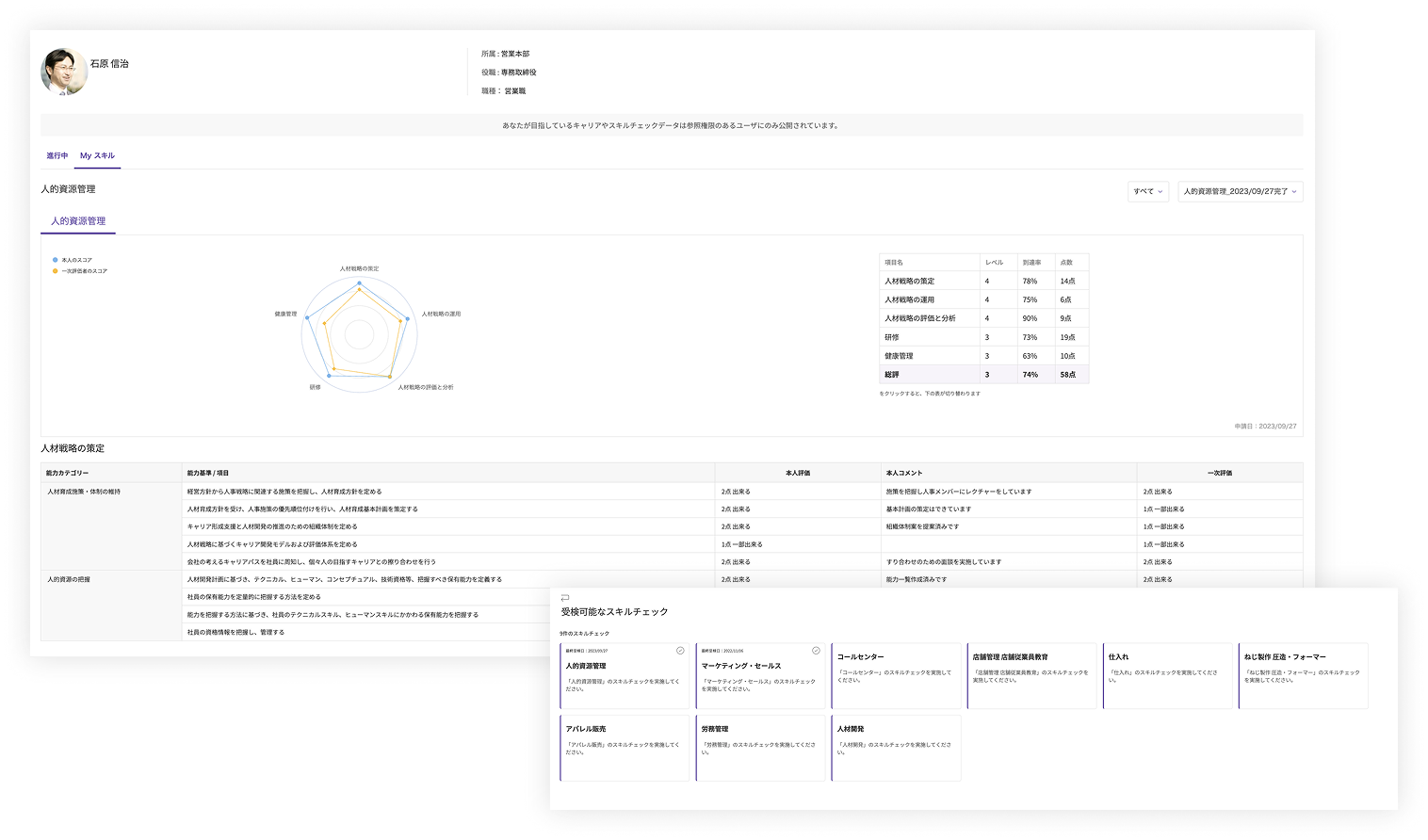 システムを導入する前は、営業店ごとに表計算ツールで結果を入力・管理していたため、全体のジョブローテーションの状況が見えづらく、適切なローテーションができていないケースがありました。現在では、システムを通じて現場と人事双方がスキル習得状況を把握できるようになり、より適切なローテーションの計画・実行ができるようになりました。
