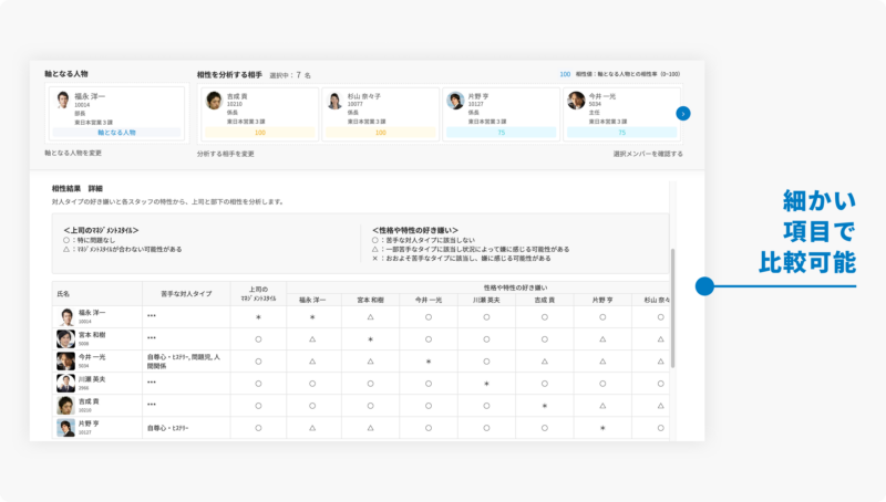 ピックアップした従業員を横並びで詳細比較