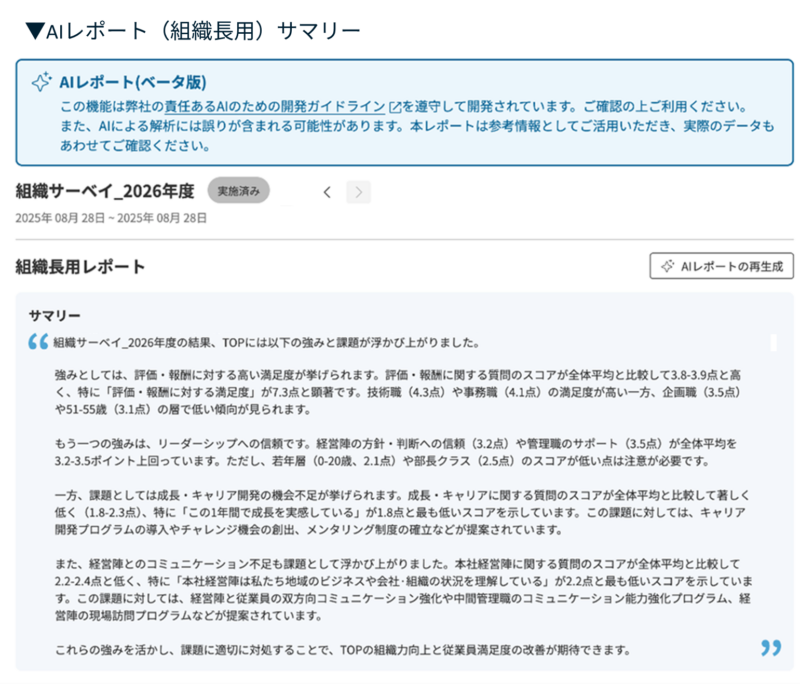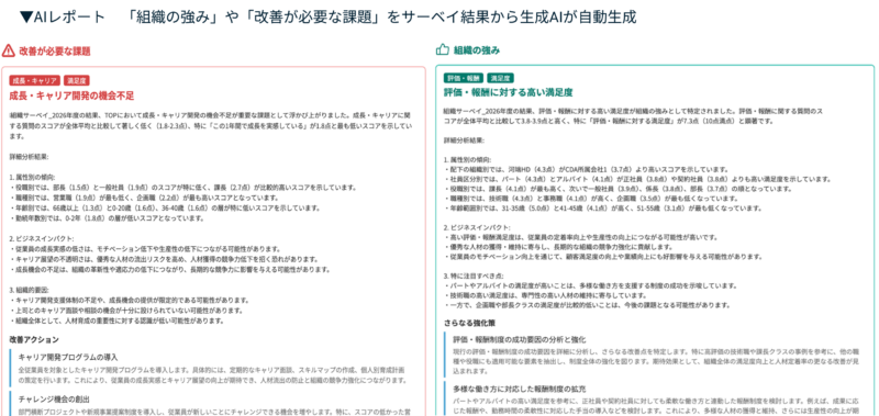 さらに、役員・人事・組織長など、レポート対象者に応じた「AIレポート」機能では、組織としての強みや改善が必要なポイント、その理由などを生成AIが自動で作成し、レポート形式で容易に把握できます。