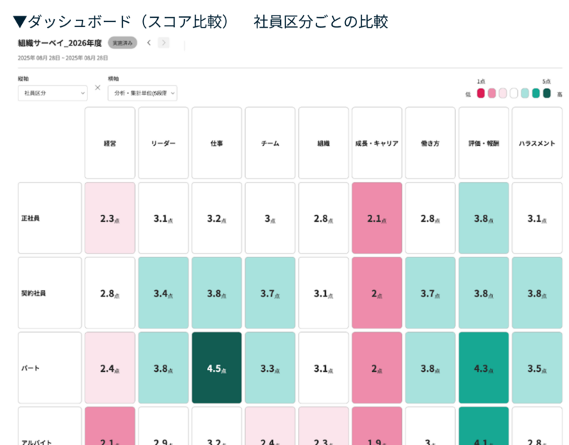 サーベイ結果はダッシュボード上でグラフィカルに表示されます。スコア比較のダッシュボードでは、組織や社員区分(正社員・契約社員・パートなど)、年齢、役職、職務などの切り口で結果を比較表示できます。例えば「正社員にとって評価・報酬への満足度は高い一方で、雇用形態にかかわらず成長・キャリアに対する満足度は低い」など、どの層がどの項目に課題を感じているかを、直感的かつ多角的に分析可能です。