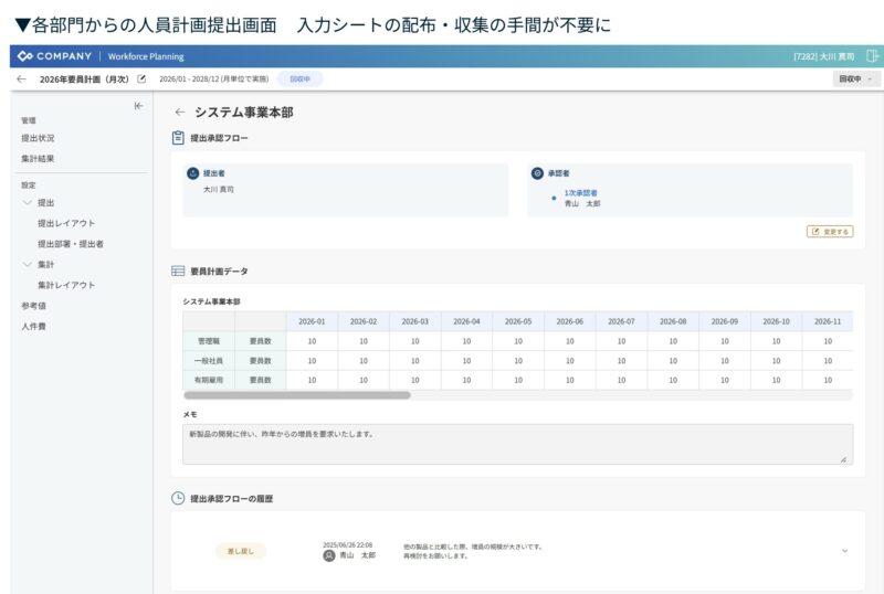 これにより、全社の人員計画、人件費計画を包括的に参照しながら、予算策定に関わる意思決定が可能になります。また、部門ごとの計画シートの管理や、承認・差し戻しのワークフローも一元化されるため、人事部門と各事業部門との細かな調整業務を円滑に進めることができます。