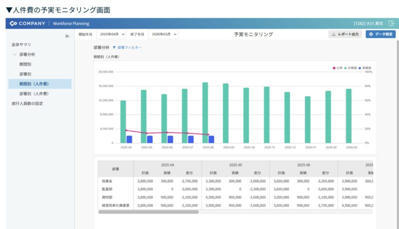 「人件費計画」機能では、策定した人件費計画と実績の差異を、ダッシュボード上でリアルタイムにモニタリングすることが可能です。これにより、どの部門で人件費予算がオーバーしているか、あるいは人材リソースの過不足が生じているかを早期に特定し、迅速な対策を講じることが可能です。人員余剰部門の探索など、配置検討の参考にも活用できます。