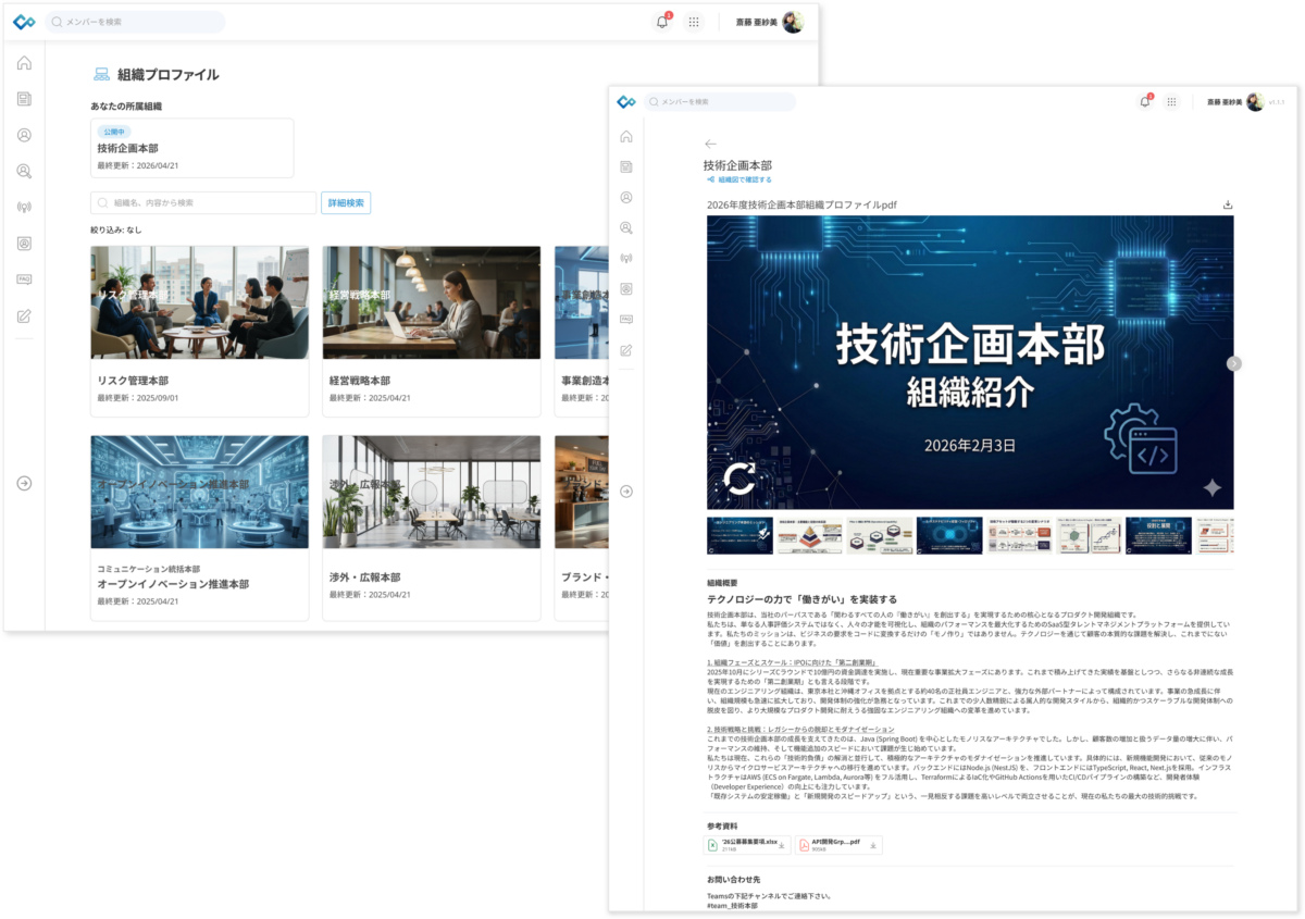 「組織プロファイル」機能を活用することで、従業員が主体的に「次に自分が挑戦したい場所」を見つける後押しを行い、キャリア形成の解像度を高めます。社内公募や異動によるキャリアアップ・キャリアチェンジを検討する際も、事前にその部署の代表者や雰囲気を把握できるため不安の解消に繋がり、新たなステップへ踏み出しやすくなります。