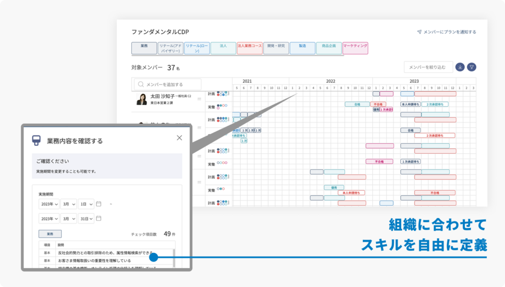 スキル項目は、現場で実際に使われている業務や役割に即して作成する必要があります。現場の実態に基づいたスキル項目でなければ、運用時に形骸化する恐れがあるため、職種別やプロジェクト別にカスタマイズする必要があります。